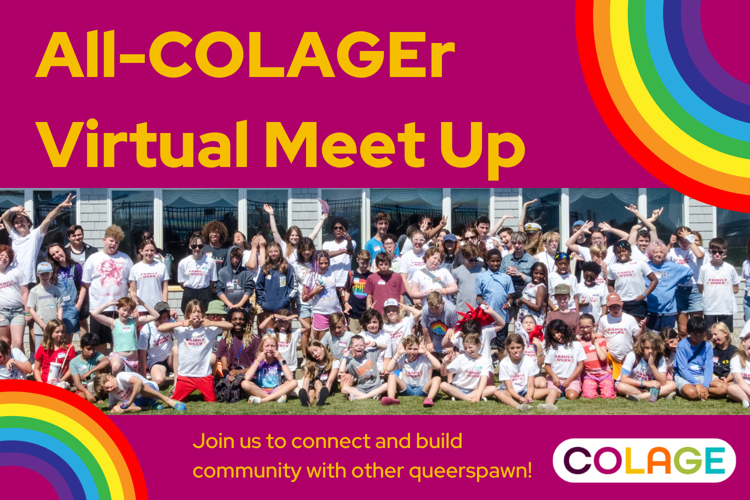 Hey COLAGEr! Drop into our monthly All-COLAGEr Virtual Meet Up! This space is for youth 8 and older, adult COLAGErs, newcomers, and seasoned COLAGE veterans alike! The only requirement is that you have one or more LGBTQ+ parent/caregiver. This is a space to make friends, build community, ask questions, play games, and chat. Break out rooms for age groups of affinity groups can be made depending on who shows up each month!