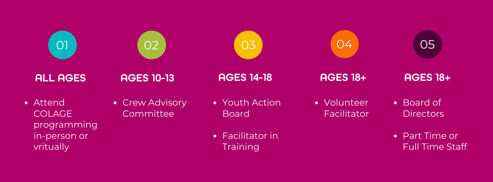 Starting is simple! Follow this track (below) and with each level, new roles and responsibilities will become available. To begin, just attend a COLAGE program, then progress through the leadership track based on your age. For more details and to join our volunteer team, fill out this form. For questions please email Jordan Polcyn-Evans, Program Manager.